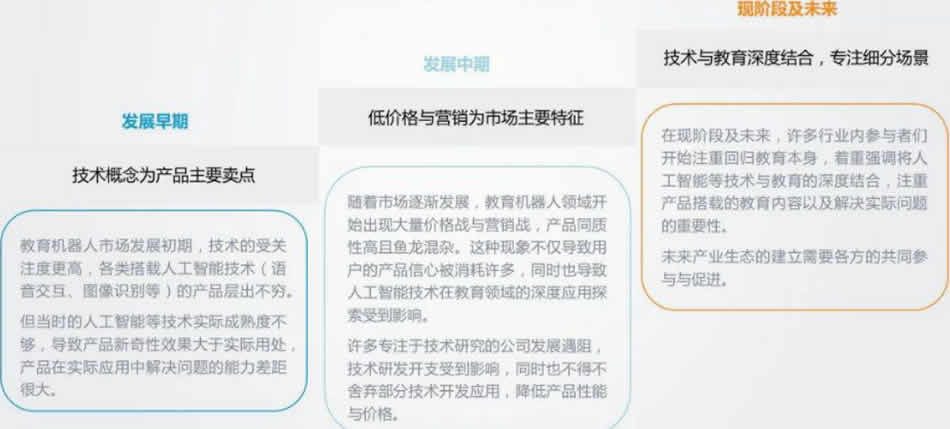教育機器人經(jīng)歷了從概念先行到價格營銷到回歸內(nèi)容與價值本質(zhì)的發(fā)展階段變遷。