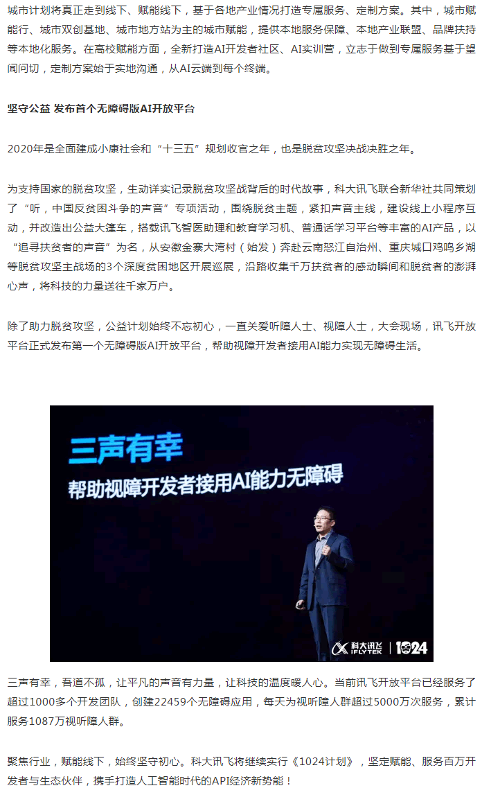 科大訊飛1024計(jì)劃全新升級(jí)為“AI賦能計(jì)劃”,發(fā)布聚焦行業(yè)的先導(dǎo)計(jì)劃、賦能線下的城市計(jì)劃、堅(jiān)守初心的公益計(jì)劃。“我們將從產(chǎn)品賦能走向行業(yè)賦能,實(shí)現(xiàn)進(jìn)階服務(wù),為生態(tài)和應(yīng)用的發(fā)展提供更契合的A.I.源動(dòng)力。” 胡國(guó)平表示。