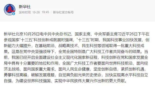 10月26日,總書記在參觀國家“十三五”科技創(chuàng)新成就展時強調,“十三五”時期,我國科技事業(yè)加快發(fā)展,創(chuàng)新能力大幅提升,在基礎前沿、戰(zhàn)略G技術、民生科技等L域取得一批重大科技成果。這是在黨堅強L導下,全黨全國特別是廣大科技工作者共同奮斗的結果。當前,我國已經開啟多面建設社會主義現代化國家新征程,科技創(chuàng)新在黨和國家發(fā)展全局中具有十分重要的地位和作用,全國廣大科技工作者要面向世界科技前沿、面向經濟主戰(zhàn)場、面向國家重大需求、面向人民生命健康,堅定創(chuàng)新自信,緊抓創(chuàng)新機遇,勇攀科技G峰,破解發(fā)展難題,自覺肩負起光榮歷史使命,加快實現G水平科技自立自強,為建設世界科技強國、實現中華民族偉大復興作出新的更大貢獻。