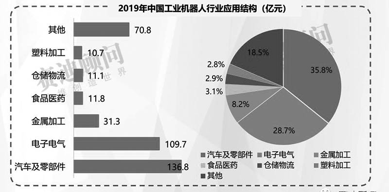 2019年,汽車及零部件在中國(guó)工業(yè)機(jī)器人市場(chǎng)的行業(yè)應(yīng)用占比為35.8%;電子電氣占比為28.7%;金屬加工占比8.2%;食品醫(yī)藥占比3.1%;倉(cāng)儲(chǔ)物流占比2.9%;塑料加工占比 2.8%;其它L域占比18.5%。